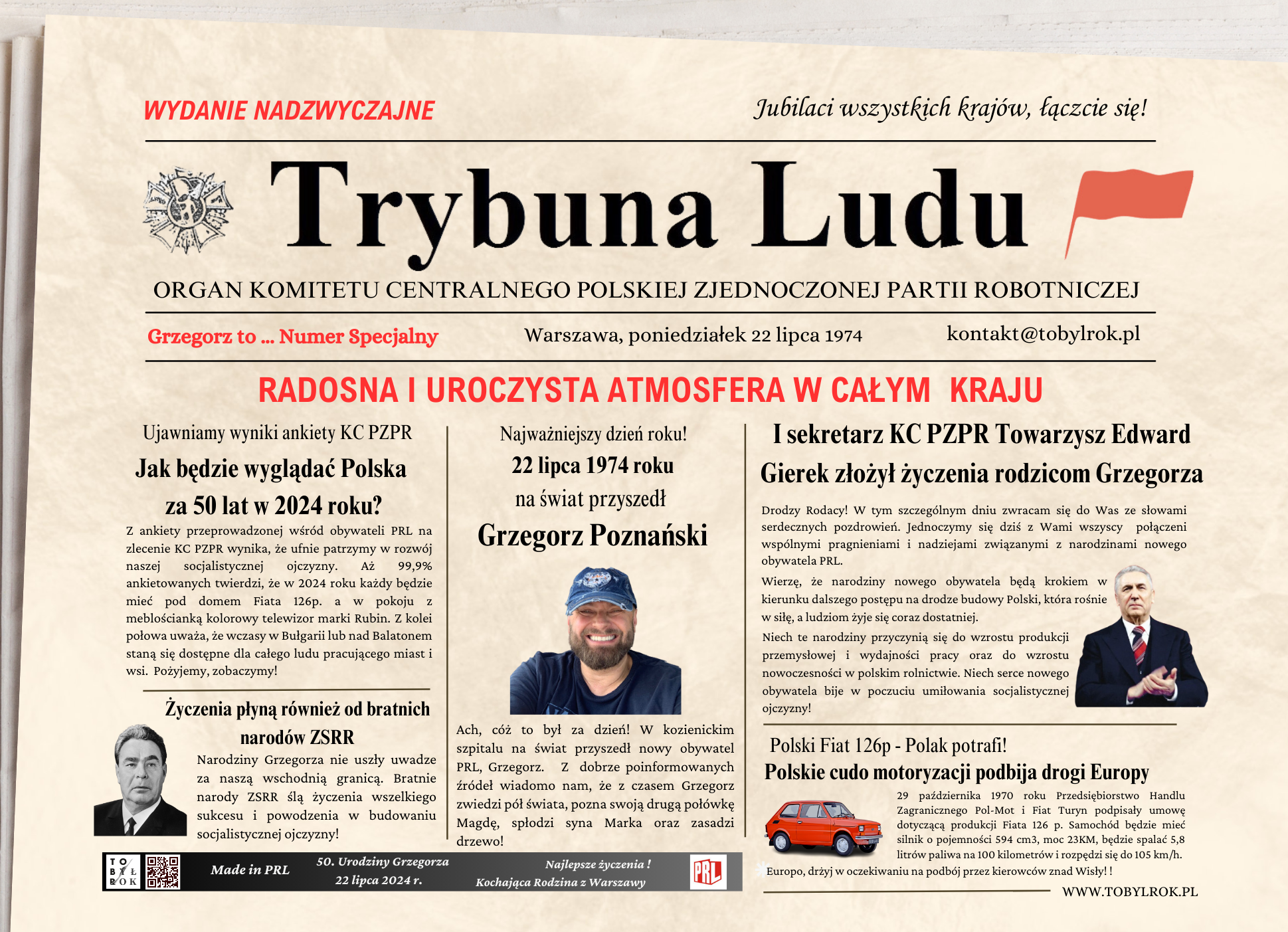 Stwórz „Wydanie Specjalne” z roku narodzin jubilata – powrót do epoki PRL.