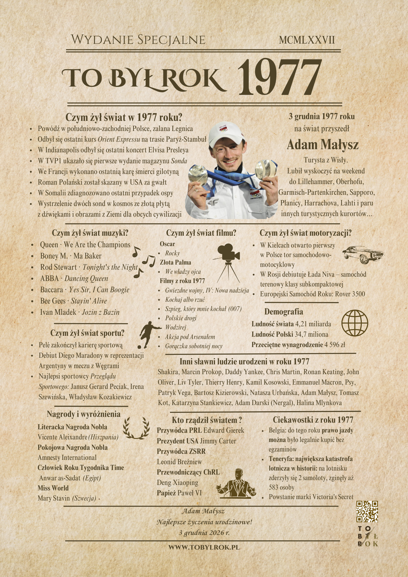 - 100% Oryginalności: Unikatowe zestawienie faktów ze świata muzyki, sportu i polityki z roku urodzenia Jubilata.